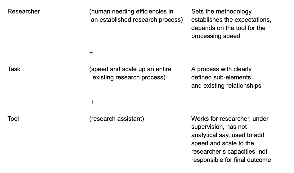 With this in mind, we can turn to the relationship between the task and the tool. The research method is already defined by the researcher, and the expectations of the researcher establishes the scale and requirements of the task. Once this is set, the tool/research assistant is used to expand the scale and scope of the researcher, meaning its primary responsibility is to expand the researcher’s ability to manage the task. The tool works on the task within very strict guidelines, and only works on one element at a time before reporting it’s work. Meaning, it is not responsible for the entire task, just the part it has been given. It is also not responsible for analysis or the final outcome, meaning it shares the overall task with the researcher.