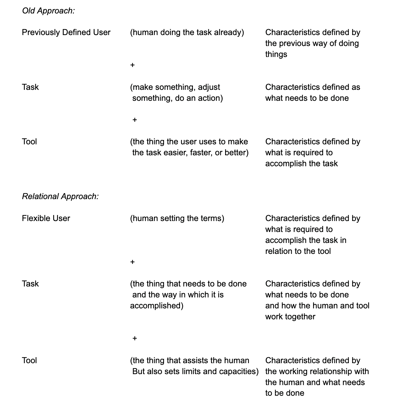 In the old way of designing a tool to help the human accomplish a task, the human and the task were understood, their characteristics and expectations defined by how it was done in the past. The human had the knowledge, the task was defined by the human, and the tool was built to fit into that understanding. This is, and will always be, a perfectly functional way to do this. And many tools, even computers, were, and will be designed according to this logic.